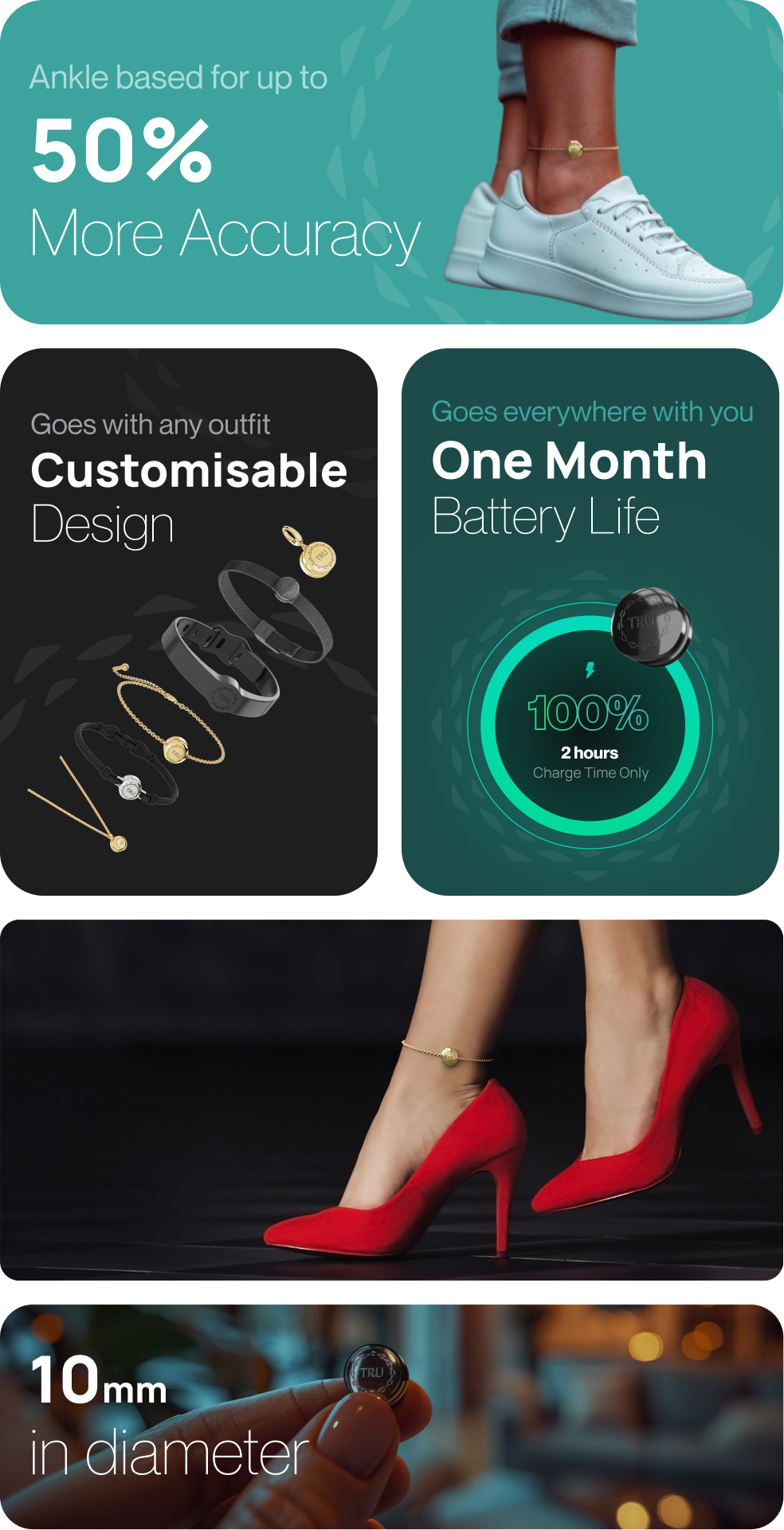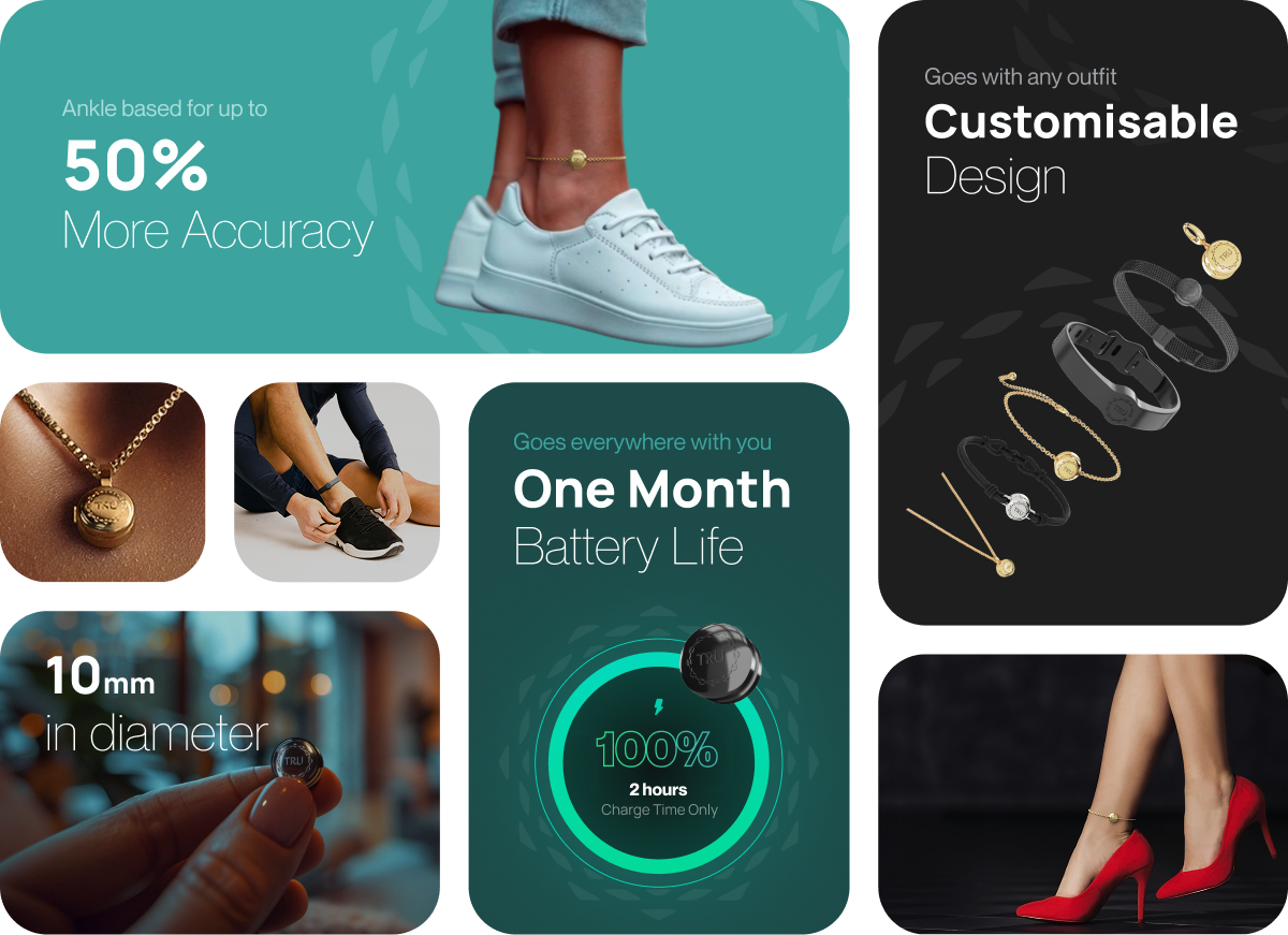 At 10mm in diameter, no more clunky designs. Wear it under your clothing or show it off as a fashion statement. TRU can be comfortably worn 24/7 above or below socks, pants or in boots.